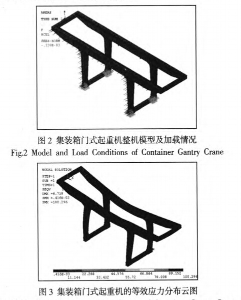 某鐵路局36t集裝箱門式起重機(jī)結(jié)構(gòu)主要參數(shù)為跨度18m,懸臂長12.5m,小車軸距8.6m。利用ANSYS及其參數(shù)化設(shè)計語言(APDL),采用sheU63單元,建立起重機(jī)整體結(jié)構(gòu)的參數(shù)化模型。將小車位于跨中,起升機(jī)構(gòu)滿載提升考慮沖擊載荷)時,作為研究跨間裂紋的最危險工況。同時考慮結(jié)構(gòu)自重、風(fēng)載、大車運(yùn)行偏斜側(cè)向力等的作用,起重機(jī)整機(jī)模型及此工況下的加載情況,如圖2所示。在跨中工況下,整機(jī)結(jié)構(gòu)的等效應(yīng)力云圖,如圖3所示。