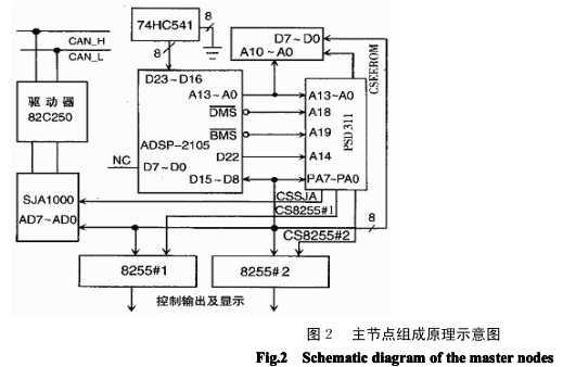 系統(tǒng)主節(jié)點結(jié)構(gòu)原理圖,如圖 2 所示。 中央處理器采用美國模擬器件公司生產(chǎn)的 ADSP2105。它是一種高性價比、性能成熟的 DSP 器件, 在一個 100ns 周期內(nèi),可以完成如下操作:取兩個操作數(shù),修改指向操作數(shù)的地址單元,使兩個操作數(shù)相乘 并將結(jié)果累加到一個 40 位的和中。由于程序循環(huán)在硬件內(nèi)完成,所以每 100ns 能執(zhí)行一次這些高級指令 的操作。WSI 的 PSD311 可編程外圍器件有效地將可編程邏輯、I/O 端口和存儲器集成在一塊芯片上,可 以實現(xiàn)本系統(tǒng)的外圍功能。ADSP2105 在與 PSD311 等外圍器件聯(lián)絡(luò)方面提供了很大的時序靈活性。它 可以為 4 個分開的存儲器空間中的每一個單獨分配等待狀態(tài)數(shù)量,以適應(yīng)很寬的時序差別。我們在 ADSP2105 的 “ 等待寄存器”為 EPROM、RAM 和外部存儲器的選通脈沖安排 1 個等待狀態(tài),即 200ns 周期 時間,以滿足 PSD311 120ns 器件的時序要求。由于總線的通路布在 ADSP2105 的里面,PSD311 的數(shù)據(jù)線 與 D15~D8 連接。ADSP2105 的 “ D22”線提供 PSD311 的 “ A14”地址線,BMS(Boot Memory Select)充當 EPROM 的片選并與 PSD311 的 “ A19”輸入相連接。 選用 SJA1000 作為 CAN 控制器,驅(qū)動器使用 CAN 控制器接口芯片 PCA82C250。EEPROM 用作數(shù)據(jù) RAM,用于保存設(shè)置輸入的關(guān)鍵數(shù)據(jù),以防掉電時丟失。